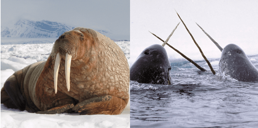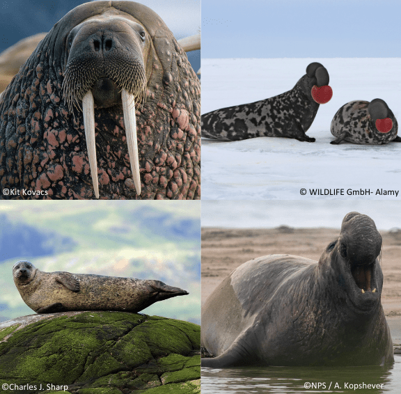 Different species of pinnipeds (Atlantic walrus, Hooded seal, Harbour seal, Elephant seal)