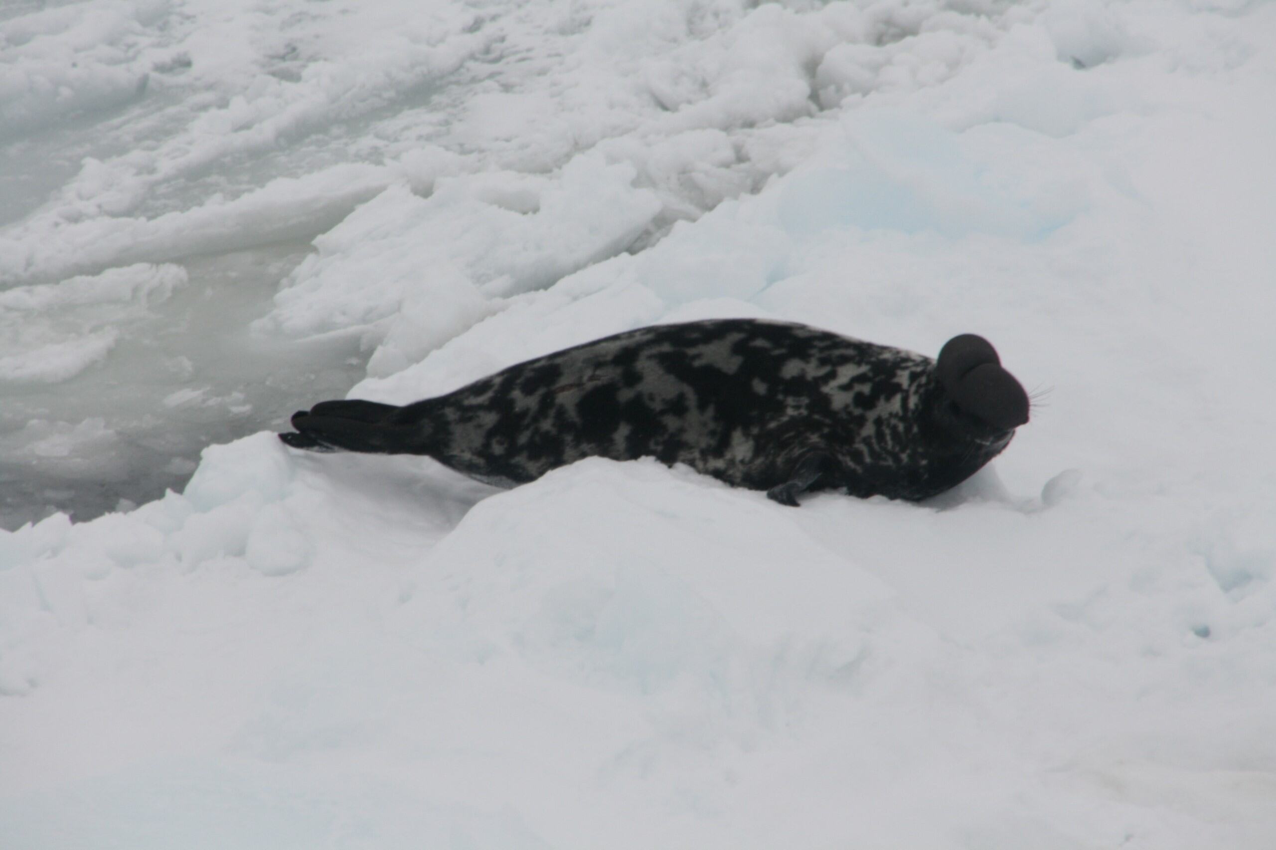 While nursing their pups, female hooded seals are frequently surrounded by one to several males who compete with one another for a mate. This competition consists mainly of display, with males repeatedly inflating their bi-lobed “hoods” and nasal septums. While the competition is usually just displays, it can also involve fighting one another. Because this hood is used in attracting the females, it can be considered secondary sexual characteristics.