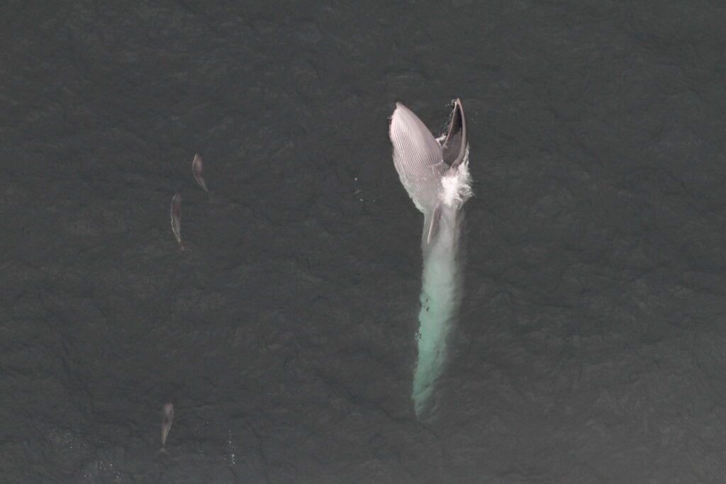 Sei whales are some of the largest whales in the world. Their name comes from the Norwegian word sei, which means pollock fish. They got that name due to appearing along the Norwegian coastline at the same time of the year as the fish. Sei whales have dark grey backs with light grey bellies with white markings. What is interesting this species, is that they are among the fastest swimming large whales. They don’t dive to great depths, and they don’t dive for long time. They do have unique diving style: instead of arching their backs and showing their tail fluke when diving down, like other large whales, sei whales simply sink below the surface. One of the recognising patterns they leave are “fluke prints”—smooth circles on the surface created by the movement of the fluke underwater.