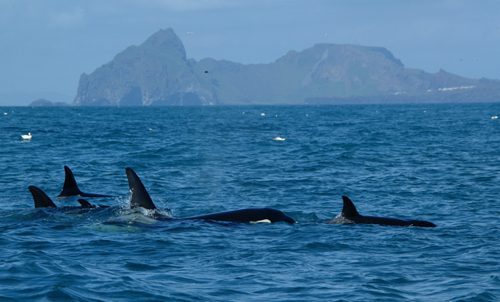 Because orcas share such strong bonds within the pods, they often engage in complex behaviours, such as cooperative hunting and playful interactions. They communicate not only with pod members but also with other pods using an array of clicks, whistles, and pulses, which can vary between different pods, reflecting the unique nature of each group. These vocalisations are distinct from one pod to another and allows family members to recognise themselves. Mother and calf pairs also have special clicks that could be considered as “names” to help them stay connected in big groups or in low visibility conditions.