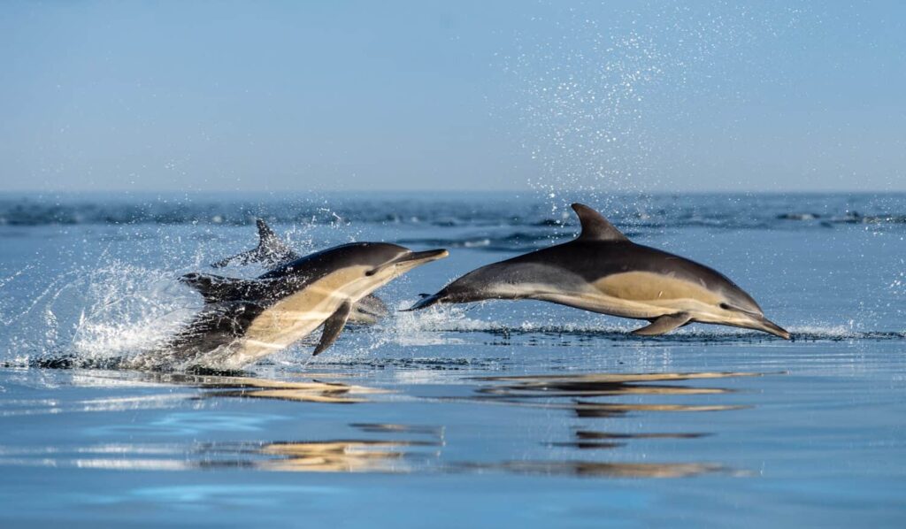 Built for life on the move, common dolphins are incredibly fast and agile. Their sleek bodies and powerful tails allow them to reach speeds over 60 kilometres per hour. They are often seen leaping from the water or riding the waves in front of boats, a behaviour known as bow-riding. While it may look playful, it can help them conserve energy or keep close to others in the group. Their speed and precision make them excellent hunters, especially when pursuing fast-swimming prey.